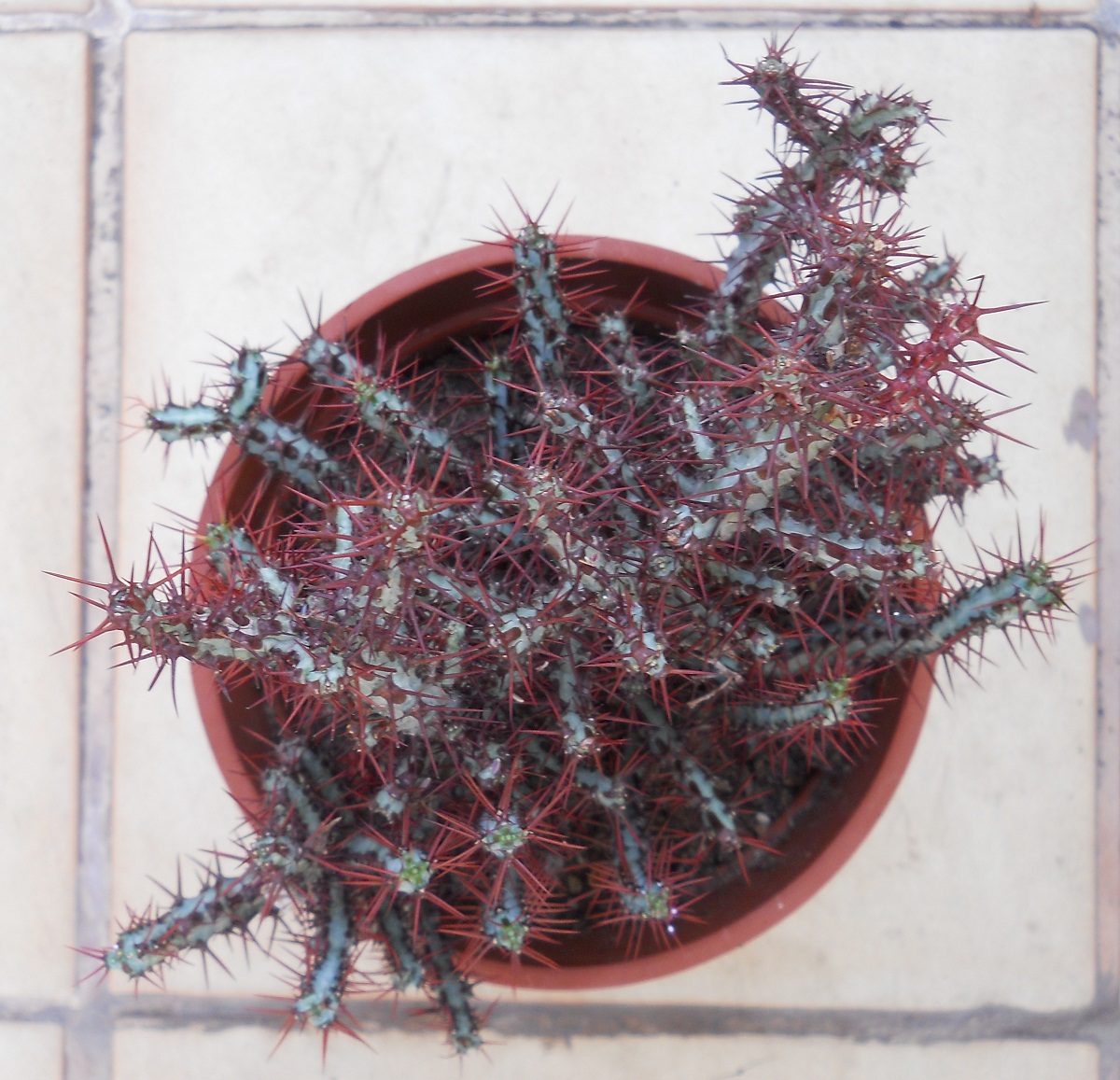 Crece en forma de pequeños arbustos formados por cientos de finos tallos espinosos de entre 1 y 2 cm de diámetro y unos 15 ó 20 cm de longitud. Estos tallos son de un color verde claro en el interior y de color marronáceo en los estremos de las costillas. A lo largo de éstas crecen las espinas, de un color rojo intenso.